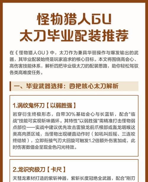 在《怪物猎人OL》中,太刀是一种高爆发、高机动性的近战武器,而合理选择和搭配太刀装备则是成为顶尖猎人的关键之一。本文将为大家全面解析太刀装备选择,帮助各位猎人们提升自己的实战能力。