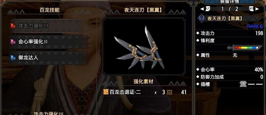 7.强力双剑之选:龙鳞双剑:龙鳞双剑作为一把带有龙属性的双刀,对于一些具有弱点的怪物非常有效,本段将介绍该武器的特点以及如何利用其龙属性进行高效打击。