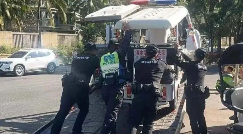 海南陵水:近期,陵水黎族自治县公安交警联合特警大队聚焦涉牌涉证三四轮电动车突出交通违法行为开展严查严管,针对三四轮电动车无牌上路、无证驾驶、假牌套牌等违法行为开展严查,并依法对违规车辆予以处罚、教育、拖移。