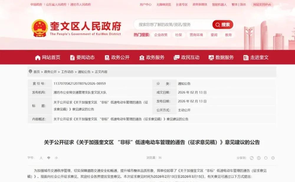 近日,山东省潍坊市公安局交通管理支队奎文区大队发布关于公开征求《关于加强奎文区 “非标”低速电动车管理的通告(征求意见稿)》意见建议的公告。
